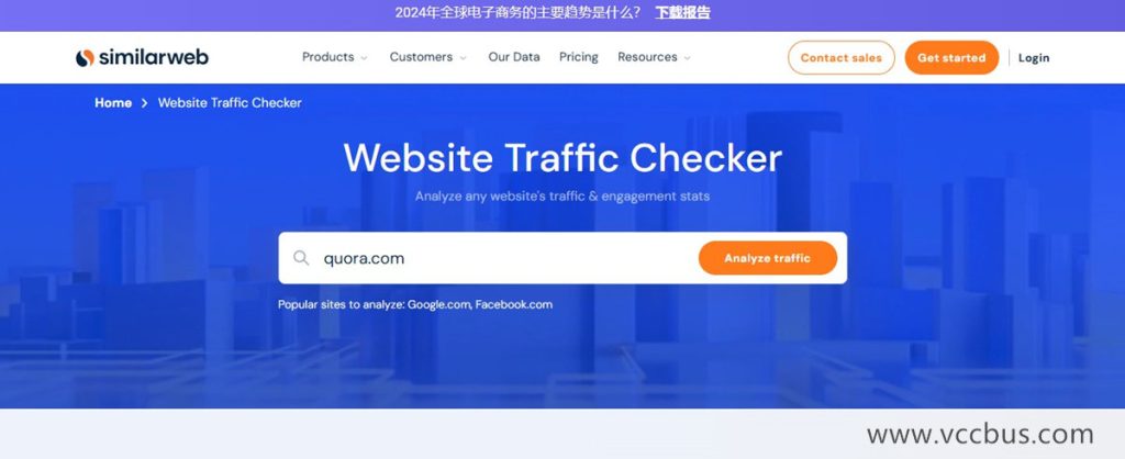 我们可以通过similarweb这个工具来查询并分析某个网站的流量来源,这是个强大的网站SEO工具,查询网站流量来源仅是它其中一个功能,还有更多强大功能这里先不细说,具体查询页面为:https://www.similarweb.com/website/。