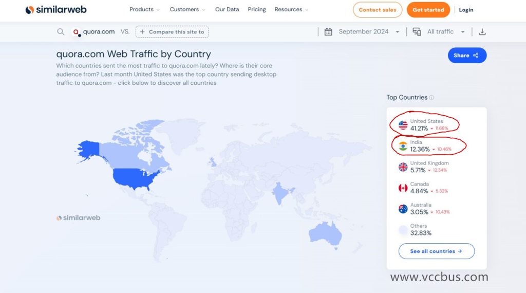 另外为了精准引流,分析内容平台的国家地区流量来源很重要,例如卖剪板机、折弯机的企业,可重点关注印度市场,一些车床设备在往印度销售利润很客观。那做内容营销就得找印度流量多的内容平台,例如Quora这个问答社区,印度用户就很多,在这里做内容运营效果还是不错的。