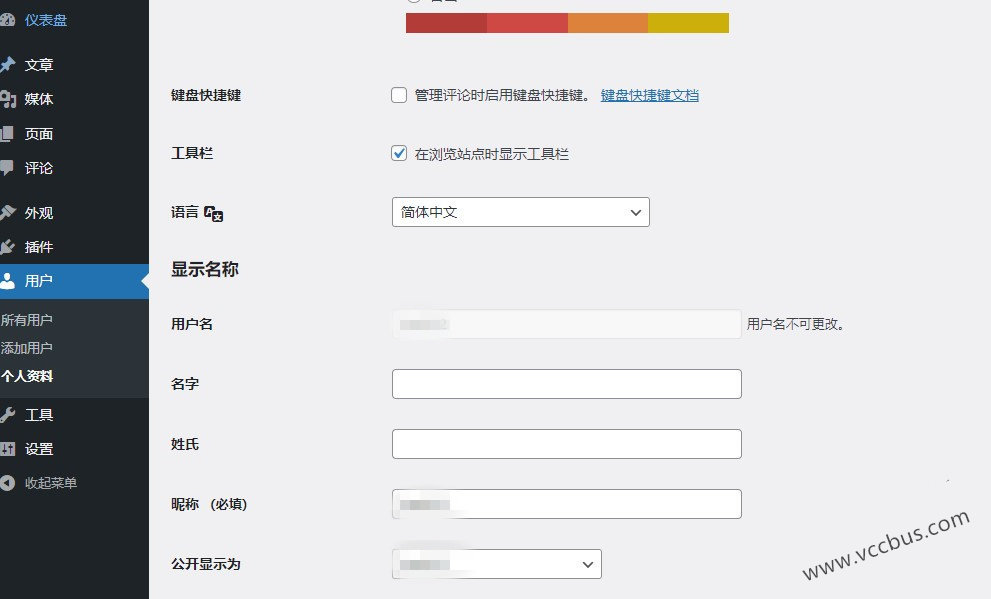 其次,在WordPress后台的用户设置那里,把用户语言设置为中文。