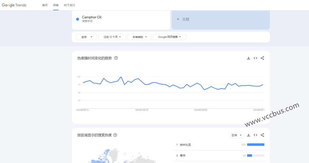 在谷歌趋势里用英文关键词”Camphor Oil”做了搜索,发现在全球范围,这个词的搜索量还是不错的,搜索分数在75左右,繁体字关键词因为地区有限仅有25分左右。分析了这个英文关键词”Camphor Oil”,作为核心词搜索热度相对于长尾词搜索量比较集中的,于是计划搞搞这个词!