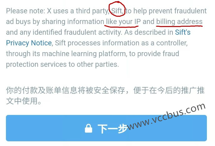 这是在填写信用卡信息支付广告费页面最下边的文字说明。推特平台采用了一家叫做Sift的支付反欺诈服务商的机器学习系统,以屏蔽例如信用卡盗刷等恶意支付。
