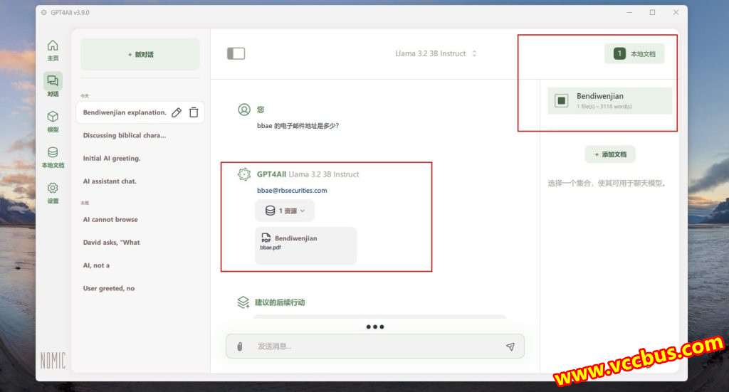 那么来做个简单测试,看大模型能否成功调用读取本地文件。首先把一份BBAE必贝证券的PDF电子账单投喂到了本地文件夹内,然后询问大模型“bbae的电子邮件地址是多少?”,它给出了正确的反馈信息,输出了这个电子邮件地址,下方显示AI成功读取了本地文件资源。