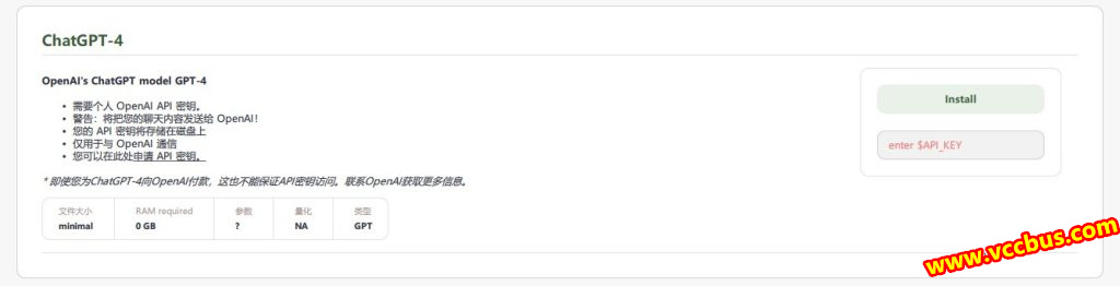 有的大模型例如ChatGPT-4不是下载安装这种用法的,而是要输入OpenAI API密钥远程调用。