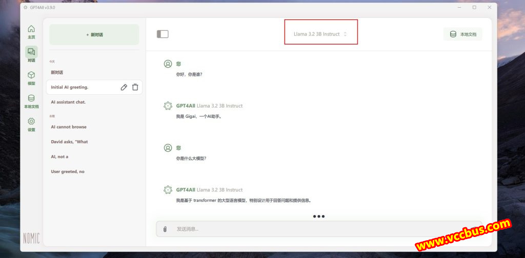 最后进入“对话”页面,上方选择已安装的大模型,正常人机对话即可。