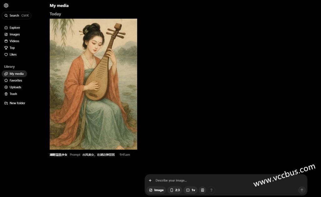 我测试体验了一下,本来打算输入提示词“性感美女”,结果系统提示内容违反政策,原来“性感”在Sora这里都是敏感词了,有点莫名其妙。后来输入提示词“古风美女,在湖边弹琵琶”,没多久就生成了以下图片,确实挺美的,而且下载下来是PNG图片格式,足足有3M大小,清晰度超级棒,做个手机壁纸那是妥妥的舒服。并且可以选择图片长宽比,既可以选择匹配手机屏幕的竖屏图片,又可以生成匹配电脑屏幕的横屏图片,超级牛逼。