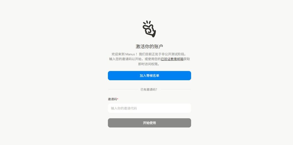 然后到这个页面有两种选择。如果此时您已经有邀请码了,在下边框框输入邀请码激活使用即可。如果当下没有邀请码,那么就需要加入等候名单了,如果您当前正在上大学,有学校的edu邮箱,那么可以用edu教育邮箱激活Manus校园版。Manus校园版的Manus有以下权益: