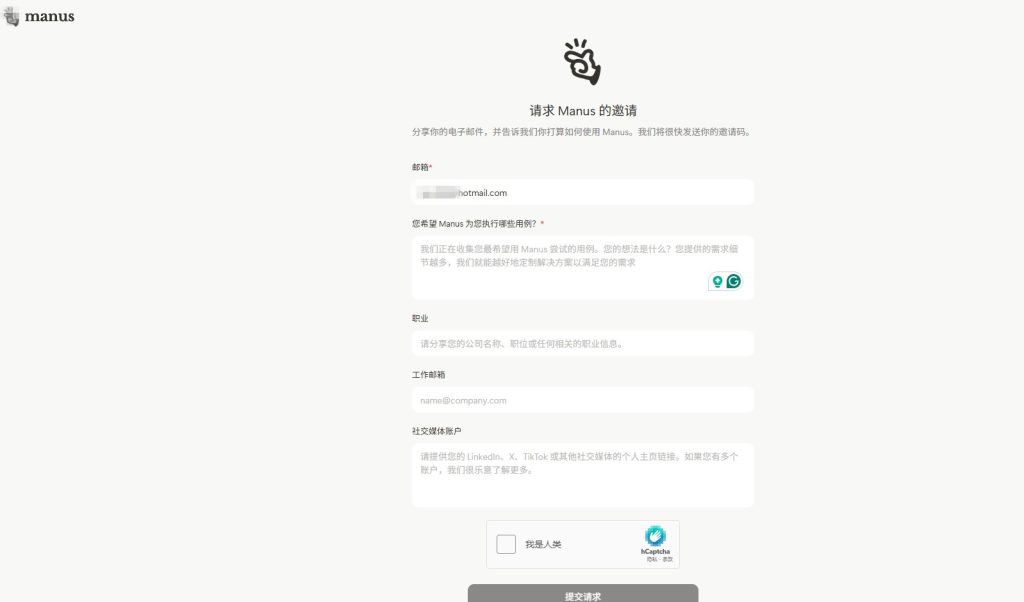 在这个页面,需要填写一个表单,以请求Manus的邀请。具体如下: