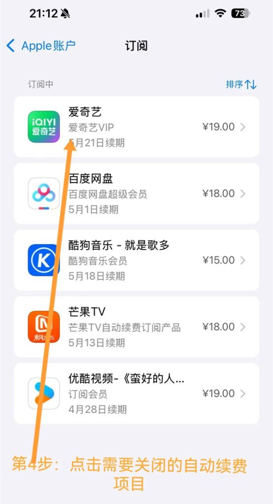 第4步:点击需要关闭的自动续费服务,例如爱奇艺。