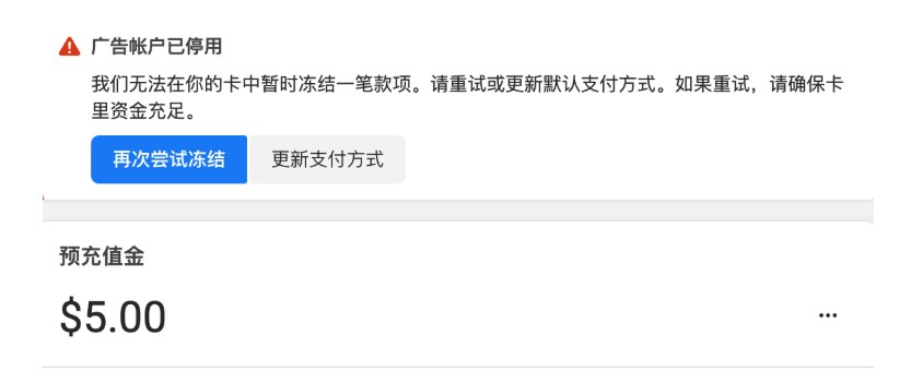 从2025年初至今,不少人在绑定虚拟信用卡到脸书广告账户时,都遇到过系统提示“冻结失败”的情况。有的小伙伴换了三四张卡,甚至五张卡,卡里明明有钱,广告也能跑,但就是扣不了款,账户还一直卡在“冻结失败”的状态。