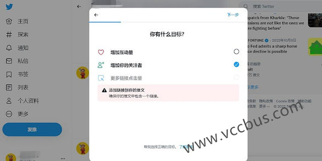 选择广告投放目的,增加互动量,增加关注者,还是其他目的。