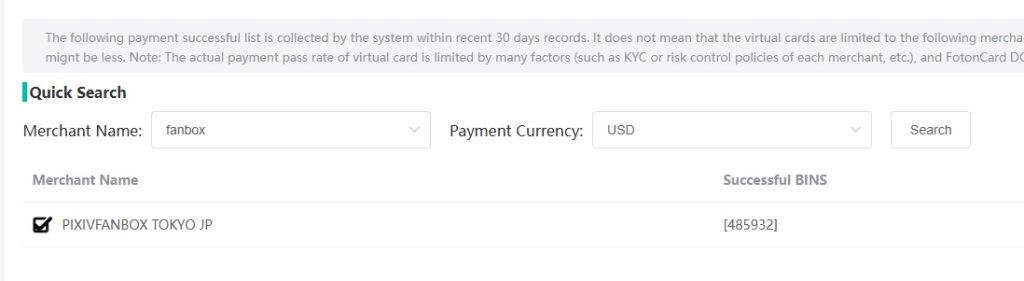 目前市面上可以申请到美国万事达Visa虚拟信用卡的平台很多,卡段也不少,我这里推荐一家叫做FotonCard的虚拟信用卡平台,这个虚拟卡平台里边有个“商户确认”功能,就是可以输入商户名称查询到他们系统中有哪些虚拟信用卡段在该商户有过成功支付记录。例如下图,我这里输入商户关键词“fanbox”,就查到有485932虚拟卡在PIXIVFANBOX这个商户有过成功付款记录,那么大家可以优先选择这个虚拟卡段。