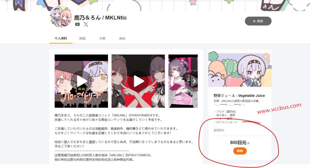 首先注册并登陆您的Fanbox账号,找到您喜欢的内容创作者页面,点击页面右侧“赞助”按钮,例如这个内容创作者的赞助价格是800日元。