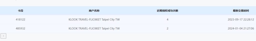 首先我通过虚拟卡平台的“商户查询功能”查到418122虚拟卡、485932虚拟卡有过在Klook台湾站成功支付记录,所以,旅行社用户可优先选择这两个虚拟卡BIN。