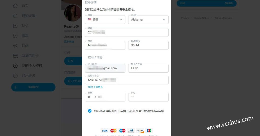 使用虚拟信用卡成功付费订阅OnlyFans小姐姐会员