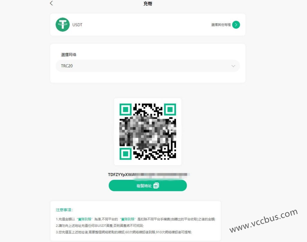 目前支持的加密数字货币有USDT、USDC、BTC、ETH四种。点击“充币”按钮进入充值页面,例如我这里使用USDT充值,选择常用的TRC20网络,系统会生成一个钱包地址,然后使用其他交易所向这个地址转账USDT即可,一般几分钟到账。其他币种操作手法一样。