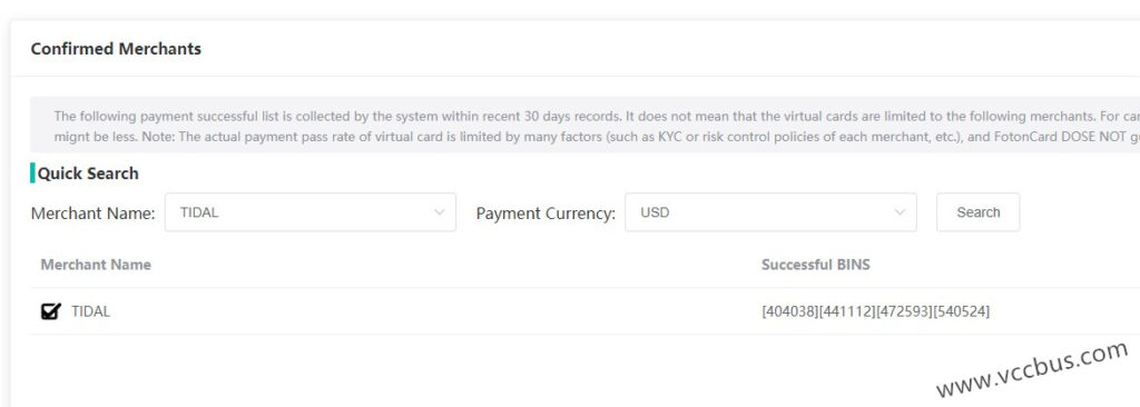 目前网络上虚拟卡平台比较多,选择哪个卡BIN合适呢?这里通过FotonCard虚拟卡平台的”Confirmed Merchants商户确认功能“查询了过往在TIDAL高清音乐平台支付成功数据,如下图所示,您可以参考选择以下卡BIN来支付订阅TIDAL:441112虚拟卡、540524虚拟卡、472593虚拟卡、404038虚拟卡等。