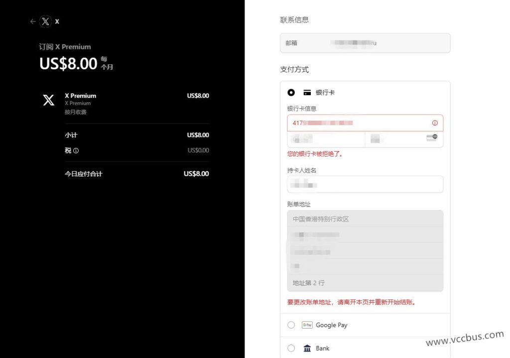 付费订阅推特账号,遇到遇到"您的银行卡被拒绝了“的错误提示