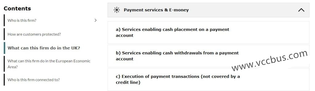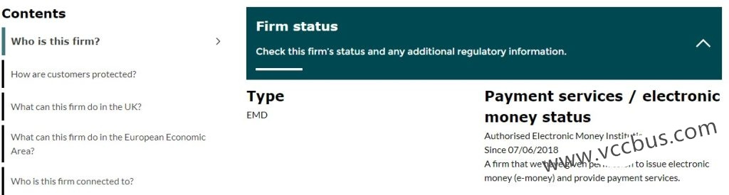 这里体现了该公司当前受监管状态。Wise公司的资质为“Authorised Electronic Money Institution经授权的电子货币机构”, “A firm that we have given permission to issue electronic money (e-money) and provide payment services受许可发行电子货币及提供支付服务”。