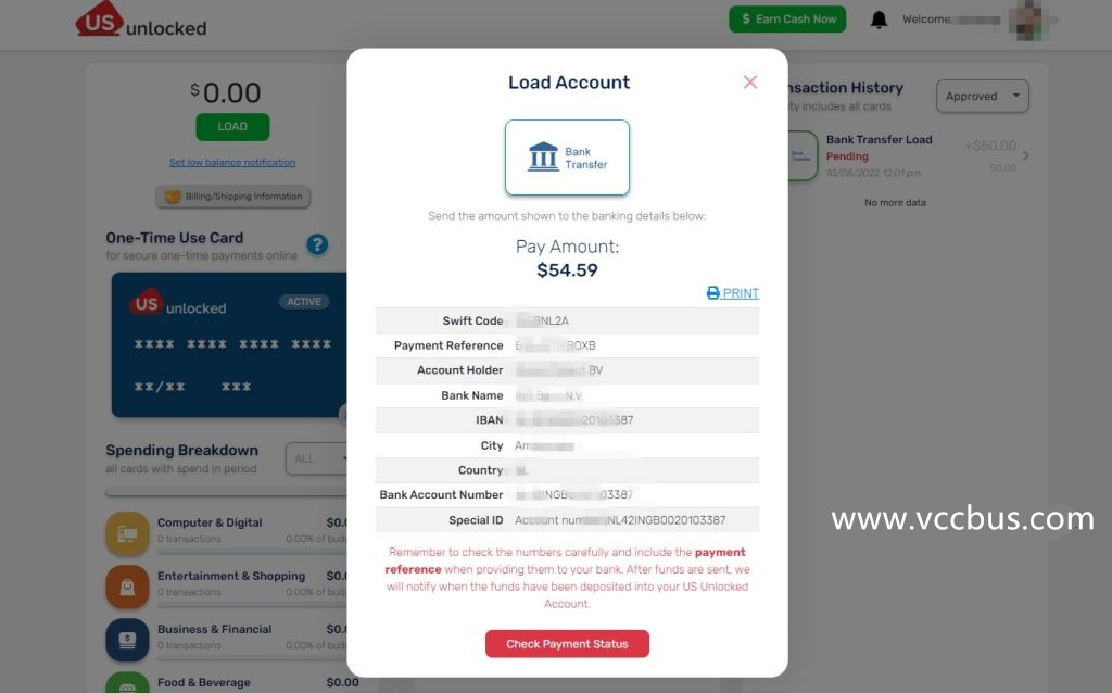 平台起冲金额50美元,首次充值时会收取15美元的终身会员费,根据注册用户所属国家,有不同的充值方式,详细可在这个页面查看https://www.usunlocked.com/countries/。中国用户目前只能国际转账了, 充值手续费为每笔金额的3%+3美元。