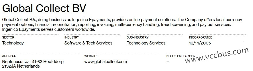 平台提供的欧洲IBAN账号收款公司为”Global Collect BV”,经查询资料,这是一家位于荷兰的电子商务支付服务商,代替处理收款业务。