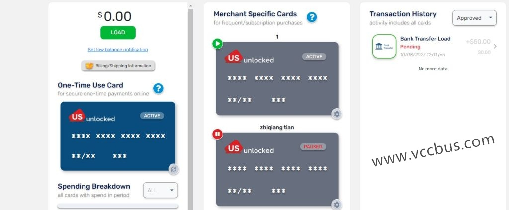 US Unlocked虚拟卡平台分One-Time Use Card和Merchant Specific Cards两种卡片形式。