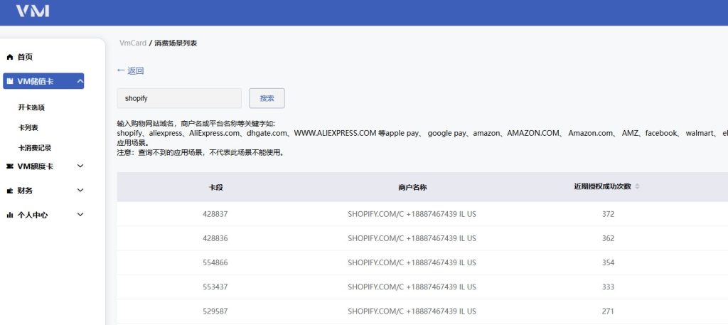 使用方法:在此页面输入商户关键词,例如您是做Shopify独立站,则输入关键词”shopify”查询,系统会显示出最近一段时间内有哪些卡BIN在Shopify有过成功支付的记录。“近期授权成功次数”越多,说明这款卡BIN在该商户付款成功率越高!查询不到数据也并不代表不能用,可能是该商户过于小众冷门,没有用户使用VMCardio虚拟U卡在该商户支付过而已。