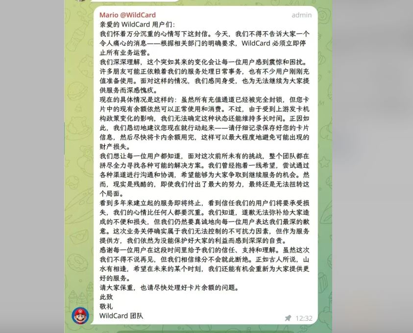 尊敬的WildCard 用户们:我们怀着万分沉重的心情写下这封信。今天,我们不得不告诉大家一个令人痛心 的消息——根据相关部门的明确要求,WildCard 必须立即停 止所有业务运营。